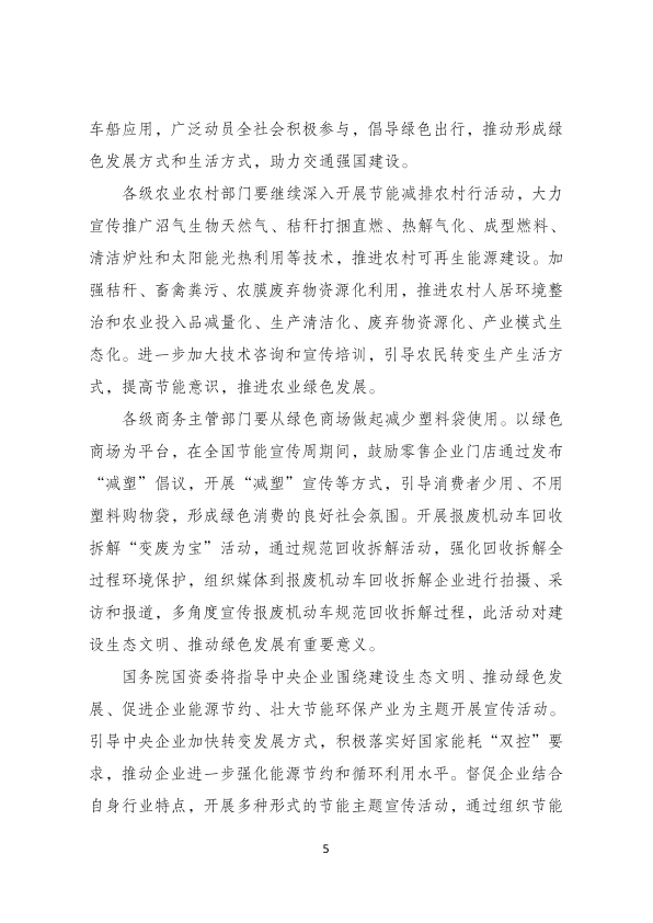 一、今年全国节能宣传周活动的主题是“绿色发展,节能先行”。在节能宣传周期间,国家发展改革委将会同有关单位围绕宣传主题,组织开展相关宣传活动,提高全社会节能意识和节能能力,不断推进生态文明和美丽中国建设。各地方、各部门要围绕宣传重点,组织动员社会各界积极参与,普及生态文明、绿色发展理念和知识,形成崇尚节约、合理消费与绿色环保的社会风尚,推动普及绿色生产生活方式。要通过群众喜闻乐见的各种宣传形式,广泛动员全社会参与节能降耗。充分发挥电视、广播、报纸等传统媒体优势,积极运用网络、微信、微博等新兴媒体,加大宣传力度。加强与网络、通讯、城管等部门的衔接,妥善做好相关宣传材料的推送、发布及张贴工作。